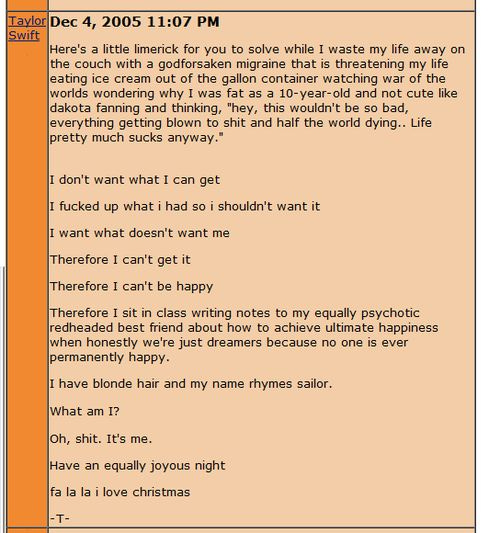 I love Taylor Swift’s music, but I don’t own all of her albums. I haven’t purchased her music in physical format since folklore. She isn’t who I would consider to be my favorite artist. I also have my qualms with how she uses her success and immense wealth. All of that doesn’t mean that I’m not a fan! Taylor Swift knows how large her fanbase is, and she knows the undying love (and millions of dollars) her fans have for her. She curates her music and image in a way that makes them feel special and individual where most famous people in the age of social media don’t. Her fanbase is rabid because she made it that way. Why should anyone ever consider it an accomplishment to be noticed by the interns running Taylor Nation, especially when all you have to do is buy a few copies of the latest colored vinyl variant and post a screenshot of your order confirmation? She’s told her fans her entire life story—heartbreaks, whirlwind adventures, dreams, regrets, scars, hopeful beginnings and wistful endings—through music and branding, and thus, they feel obligated to be at her defense and support her in every way they can. She’s the sweet girl next door. It makes sense that a larger portion of her fanbase is the average white woman; they feel seen through her. I mean, just look at this MySpace post from she was 15.